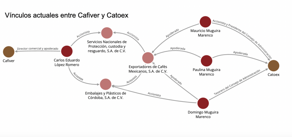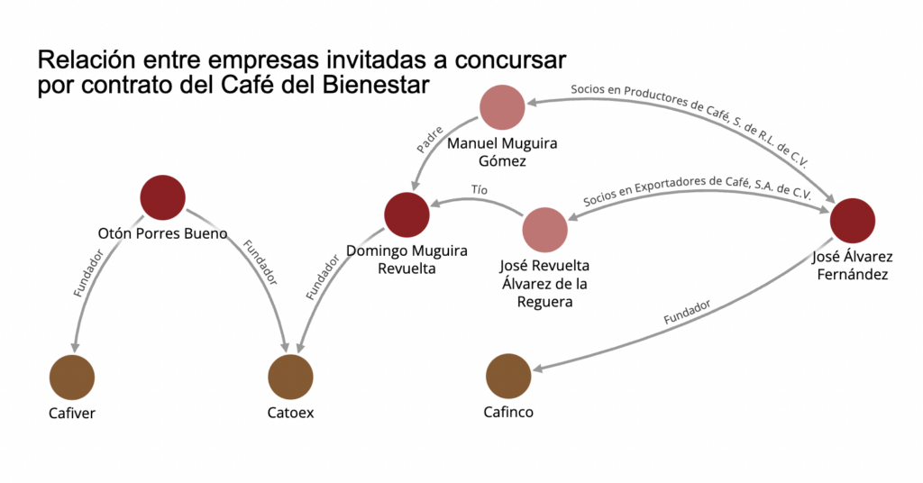 A su vez, José Álvarez Fernández, fundador de la tercera empresa invitada, Cafés Finos de Córdoba, fue socio del padre de Domingo Muguira Revuelta, fundador de Catoex. Lo cual muestra que las tres empresas invitadas a competir por el contrato para maquilar el café del Bienestar poseen relaciones entre sí.