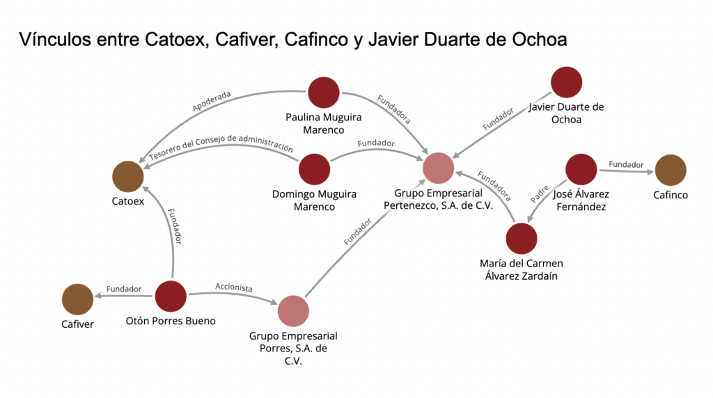 En este entramado, Eduardo Álvarez Zardaín, actual propietario de Cafinco23“M4. Cafés Finos de Córdoba, S.A. de C.V.”, SIGER, 21 febrero 2012, share.mayfirst.org/s/8WLtrg9S7ciaR5z., es tío y socio de José y Alejandro Álvarez Rocha24Los vínculos familiares y societarios fueron verificados mediante consultas en línea de actas de nacimiento y  registros mercantiles.