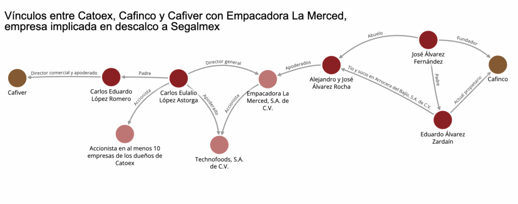 Además de esto, la red de empresas que vincula a Catoex, Cafiver y Cafinco opera dentro de un ecosistema donde también figuran proveedores previamente cuestionados, entre ellos Empacadora La Merced, S.A. de C.V., señalada por irregularidades en contratos de Segalmex.
